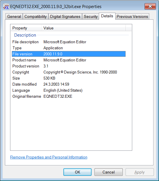 So now a vulnerability was reported in this executable and Microsoft spawned their fixing procedure: they reproduced the issue using Embedi's proof-of-concept, confirmed it, took the source code, fixed the issue in the source code, re-built EQNEDT32.EXE, and distributed the fixed version to Office users, who now see version 2017.8.14.0 under its properties.