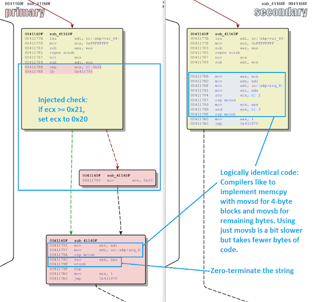 As shown on the above image, a check is injected before the inlined memcpy code. Note that in 32-bit code, memcpy is typically implemented by first copying blocks of 4 bytes using the movsd (move double word) instruction, while any remaining bytes are then copied using movsb (move byte). This is efficient in terms of performance, but whoever was patching this noticed that some space can be freed by only using movsb, and perhaps sacrificing a nanosecond or two. After doing so, the code remained logically identical but now there was space for injecting the check before it, as well as for zero-terminating the copied string. Again, an impressive and clever hack (and there was still an extra byte to spare - notice the nop?)
