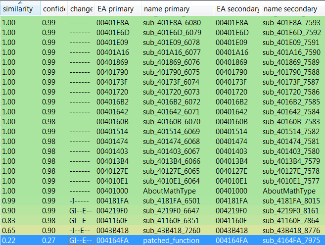 If you're diffing binaries a lot, you'll notice something highly peculiar: All EA primary values are identical to EA secondary values of matched functions. Even the matched but obviously different functions listed at the bottom are at the same address in both EQNEDT32.EXE versions.
