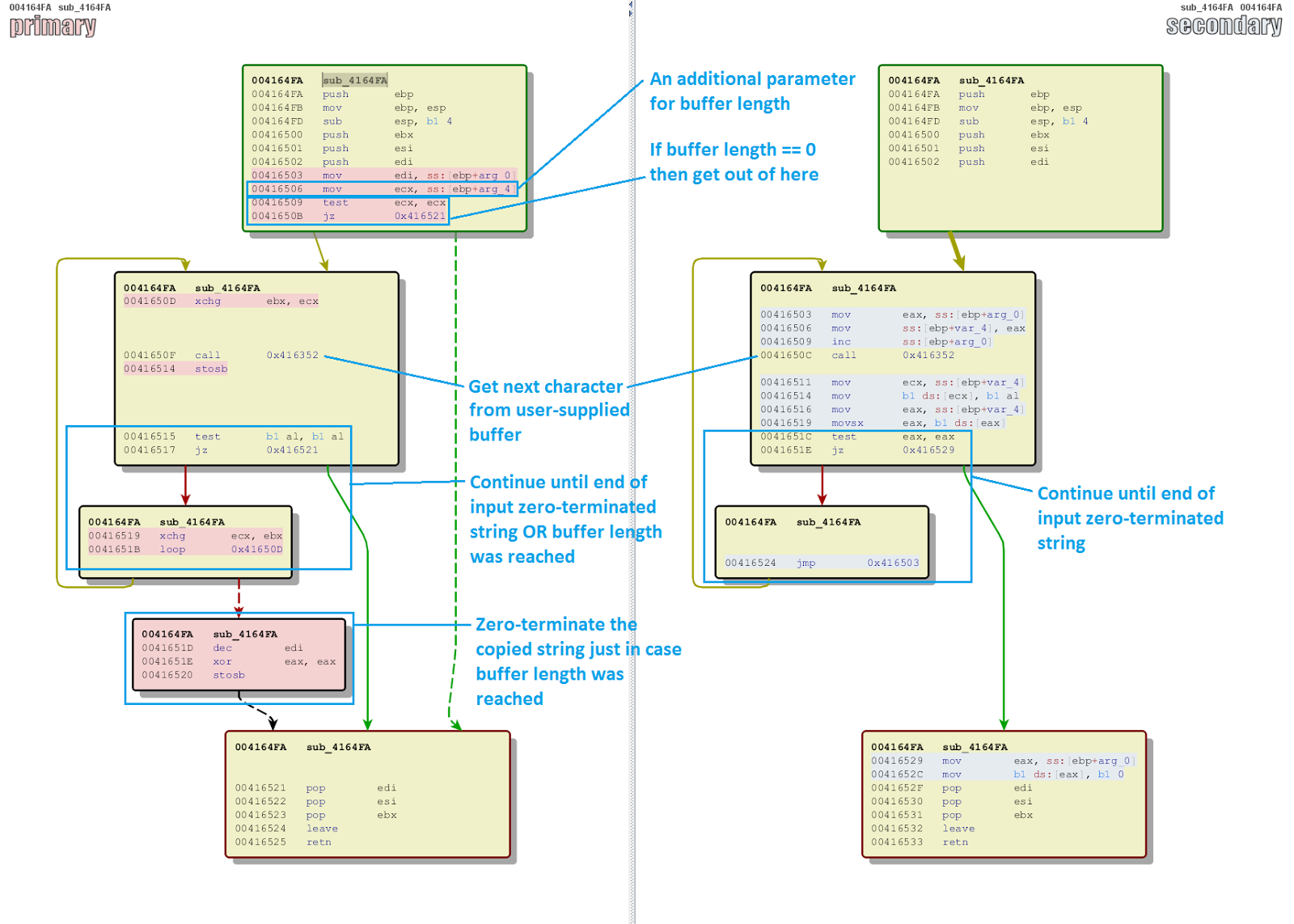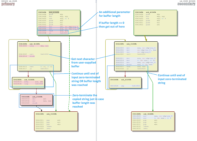 As you can see, whoever patched this function not only added a check for buffer length in it, but also managed to make the function 14 bytes shorter (and padded the resulting gap before the adjacent function with 0xCC bytes for style points :). Impressive.